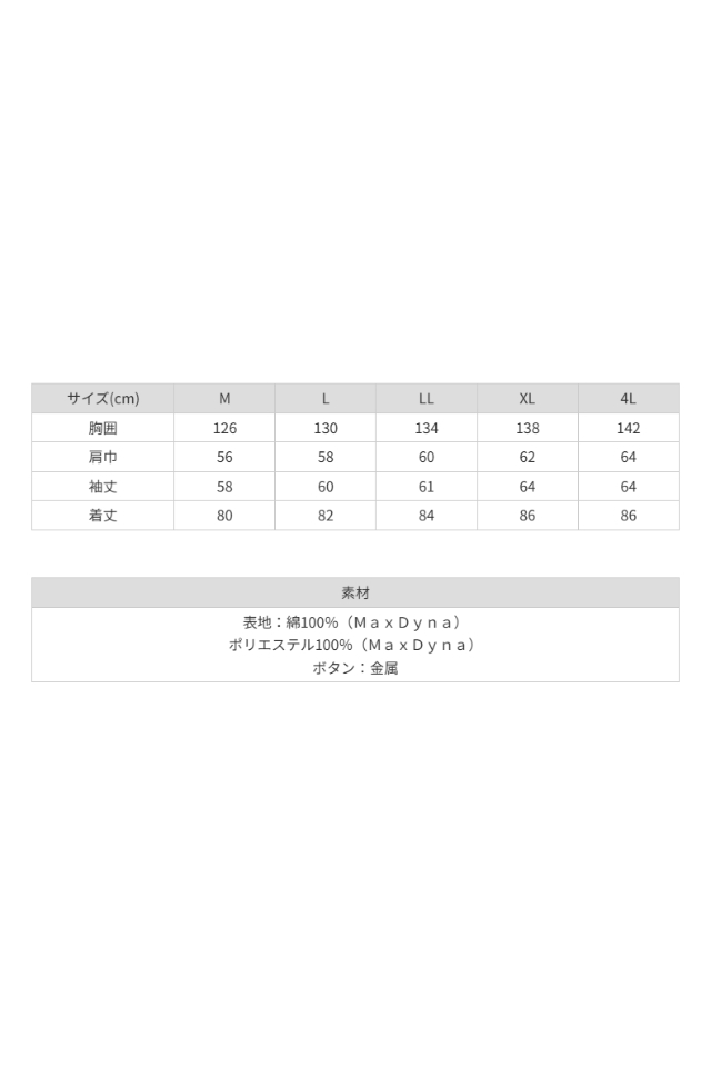 表地:綿100%(MaxDyna) ポリエステル100%(MaxDyna) ボタン:金属 |