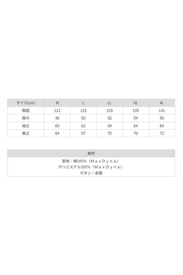 表地:綿100%(MaxDyna) ポリエステル100%(MaxDyna) ボタン:金属 |