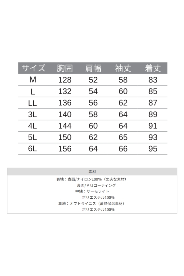 表地:表面/ナイロン100%(丈夫な素材) 裏面/PUコーティング 中綿:サーモライト ポリエステル100% 裏地:オプトライニス(蓄熱保温素材) ポリエステル100% |