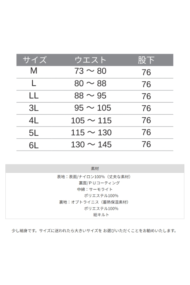 表地:表面/ナイロン100%(丈夫な素材) 裏面/PUコーティング 中綿:サーモライト ポリエステル100% 裏地:オプトライニス(蓄熱保温素材) ポリエステル100% 総キルト |