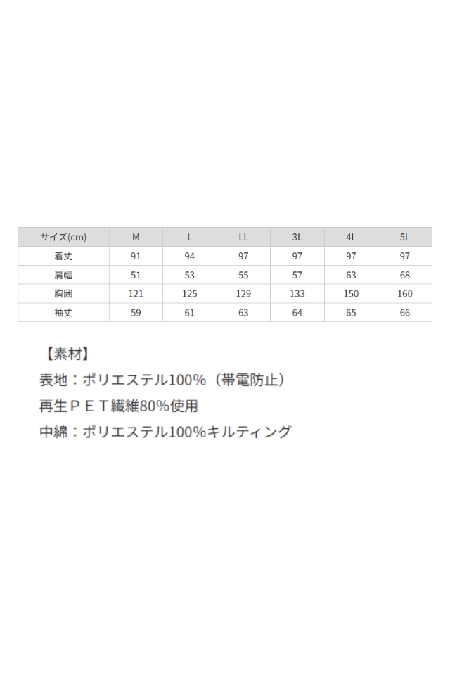 ポリエステルツイル表地に、中綿キルトで暖かい空気層を形成。