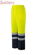 蛍光素材と再帰反射テープを使用したISO20471 JIS8127適合の高視認性防水防寒パンツ。