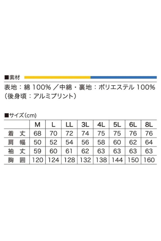 表地は綿100%、中綿・裏地はポリエステル100%。