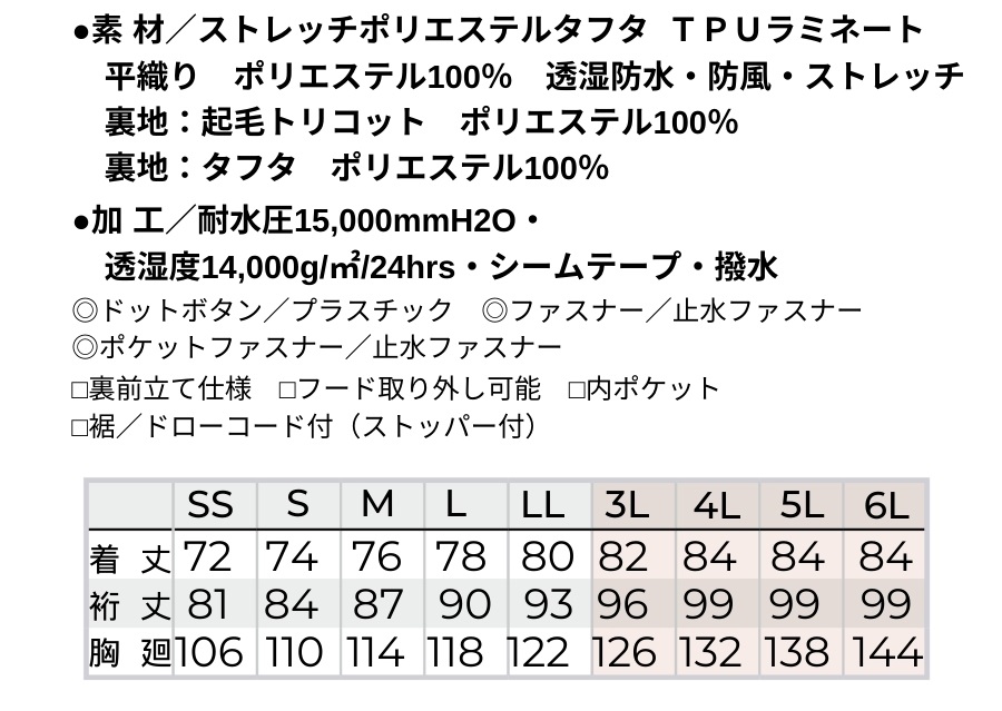 SS~6Lまで選べる男女兼用の防水防寒着。