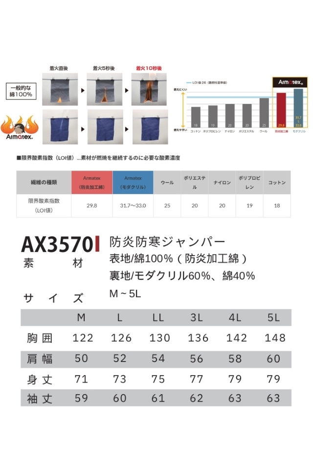 火花が飛び交う溶接現場や、海風が冷え込む造船ヤードなど、「火」と「寒さ」の両方から身体を守りたいプロのための一着。表地には綿100%に特殊な防炎加工を施したArmatex(アルマテックス)防炎綿を使用し、万が一着火しても燃え広がりにくく自己消火性を発揮し生地が溶けて肌に付着することがない安全設計。裏地には難燃性を持つモダクリル混フリースを採用し、防炎性能に加えてしっかりとした保温力も備えた、防炎×防寒の心強い冬用作業ブルゾンです。