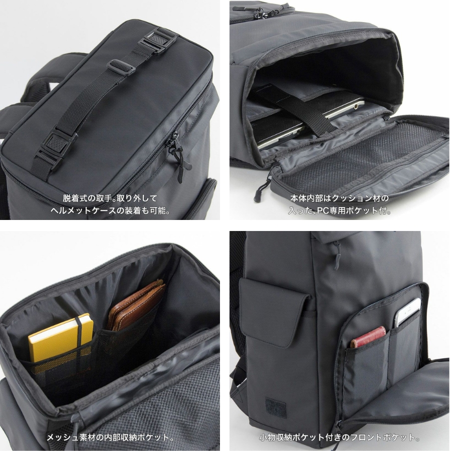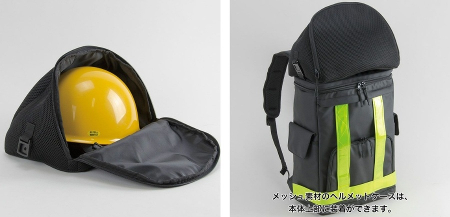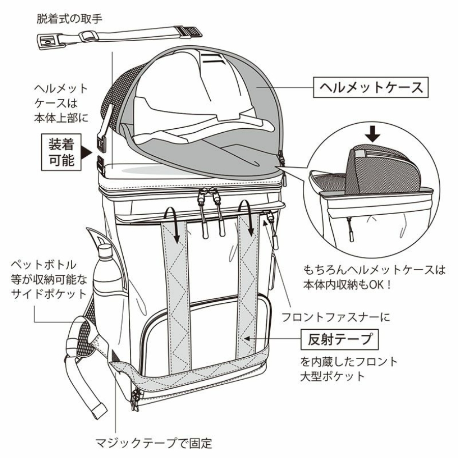 ヘルメットが入るポーチ付きでポーチはリュックに脱着可能。