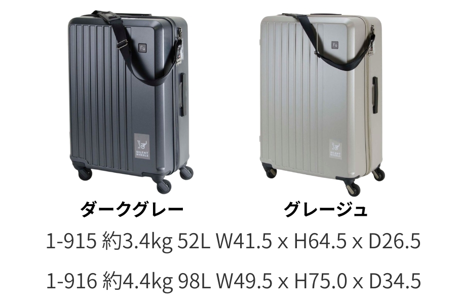52リットルと98リットル容量のタイプの肩ベルト付きキャリー。
