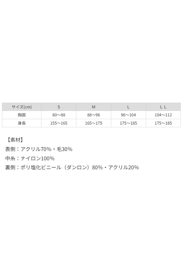 | 胸囲 | 80~88 | 88~96 | 96~104 | 104~112 |